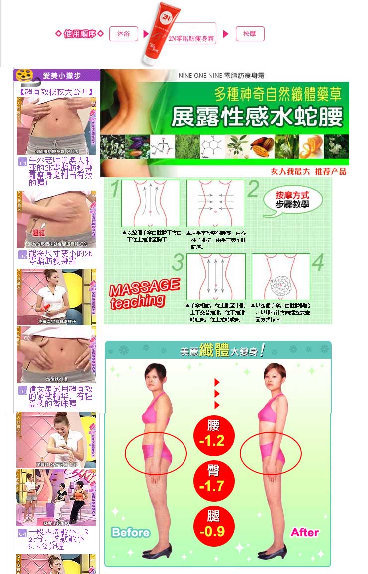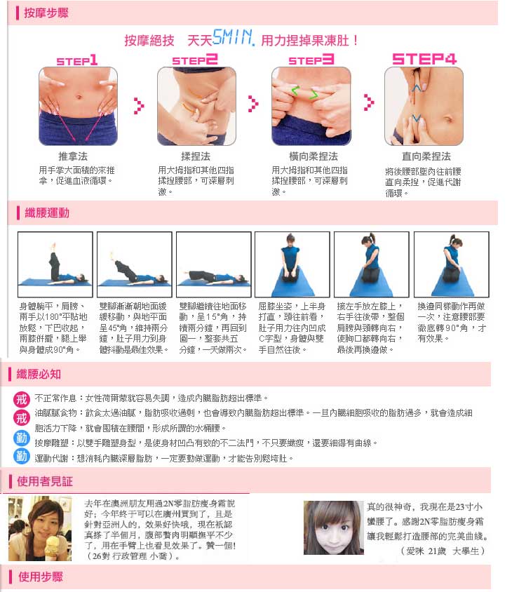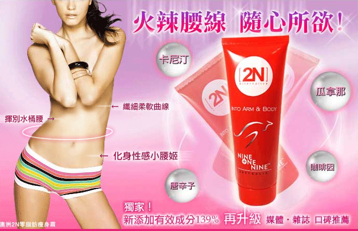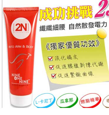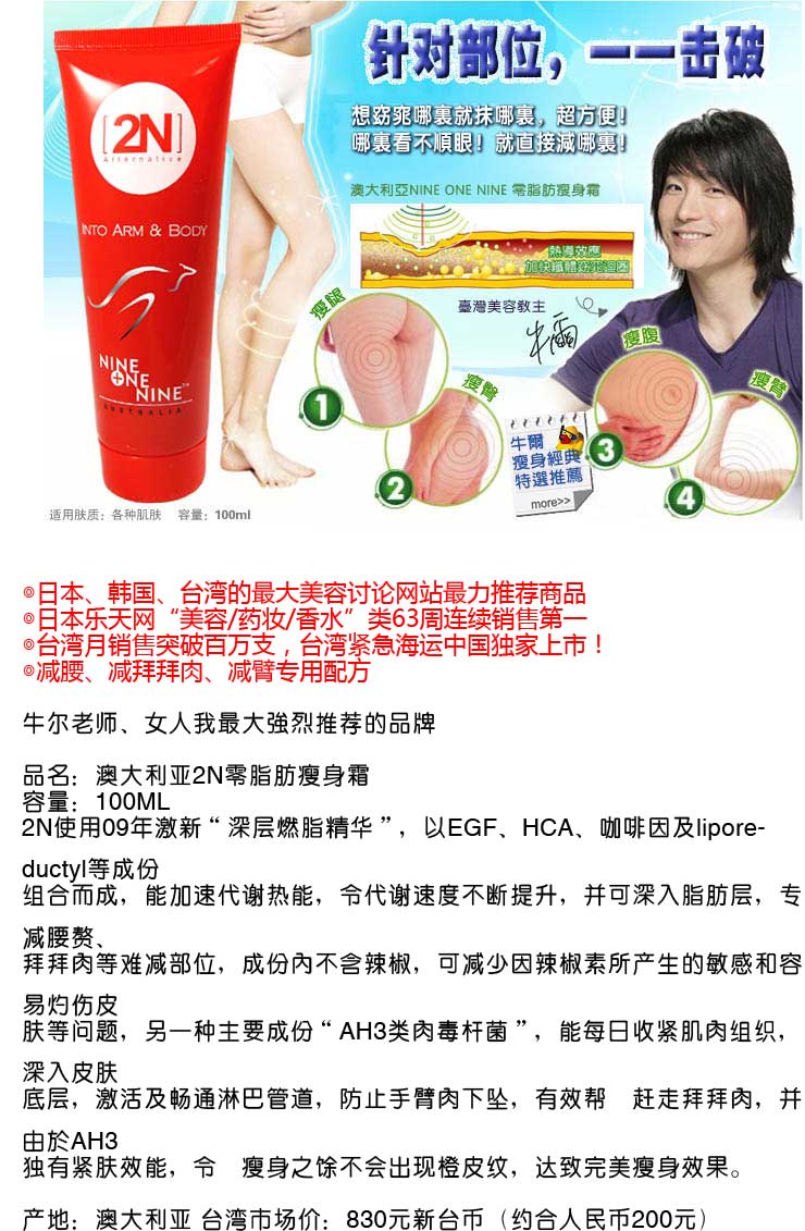 澳大利亚2N零脂肪瘦身霜容量:100ML??2N使用09年激新“深层燃脂精华”,以EGF、HCA、咖啡因及liporeductyl等成份组合而成,能加速代谢热能,令代谢速度不断提升,并可深入脂肪层,专减腰赘、拜拜肉等难减部位,成份内不含辣椒,可减少因辣椒素所产生的敏感和容易灼伤皮肤等问题,另一种主要成份“AH3类肉毒杆菌”,能每日收紧肌肉组织,深入皮肤底层,激活及畅通淋巴管道,防止手臂肉下坠,有效帮妳赶走拜拜肉,并由於AH3??独有紧肤效能,令妳瘦身之馀不会出现橙皮纹,达致完美瘦身效