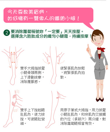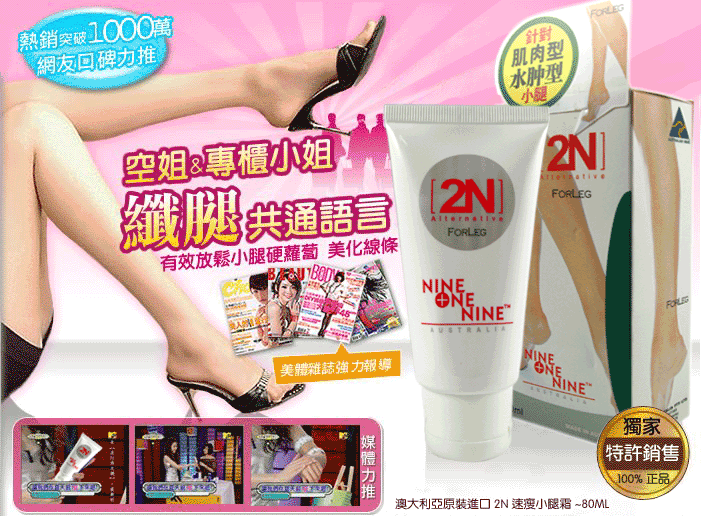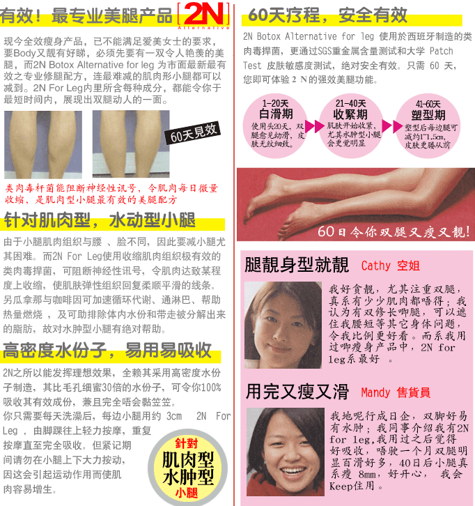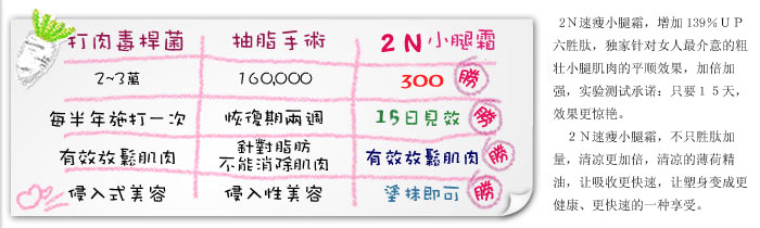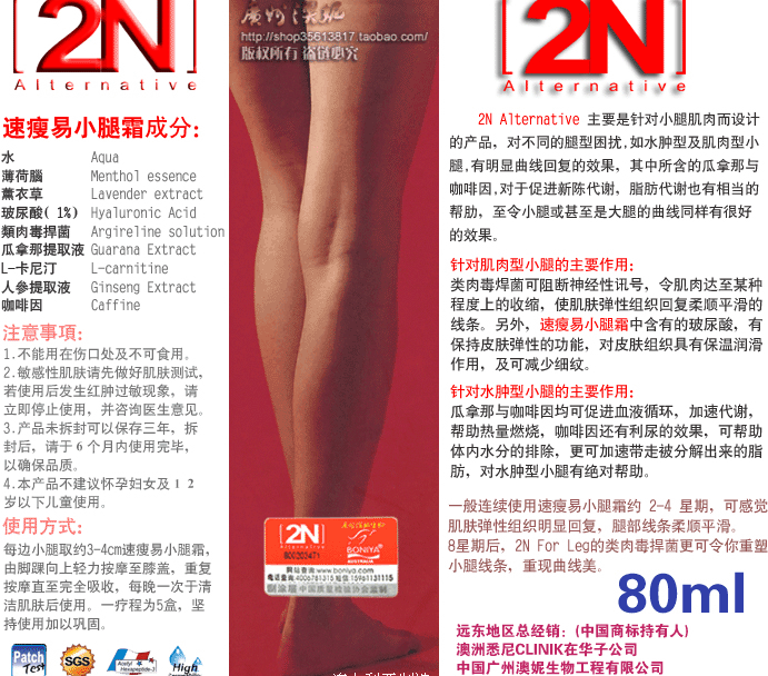 六胜肽:(又称:为类肉杆菌素) 完全放松你紧张的腿部肌肤,还你平顺的腿部线条。 瓜拿那萃取: 促进小腿多余热量的循环燃烧。 薄荷提取物: 清凉舒爽的质感,舒缓肌肤疲劳。 萝卜腿的生成,主要是因运动姿势的不良,造成小腿肌肉的紧绷,有的人会透过医学美容注射肉毒杆菌来改善,而肉杆菌的注射主要是使肌肉瘫痪,打针的肉毒杆菌须有专业医师执行,且有可能会形成局部溃烂,又要忍受打针的痛苦,费用也极为高昂,且剂量不容易控制。生物科技蓬勃发展的今天,六胜肽又被称为类肉毒杆菌素,即具有抑制神经物质过度释放、影响皮下神经与肌肉间的传送蛋白作用,有效放松肌肉,且无其他的副作用,故已渐渐取代传统注射的医学美容方式。 1-20天:白滑期 21-40天:收紧期 41-60天:塑型期。 60天疗程 安全有效 60日令你双腿又瘦又靓! 中文名称:2N 速瘦小腿霜 产 地:澳大利亚 规 格:80ML 主要针对小腿肌肉而设计的产品,对不同的腿型困扰,如水肿型及肌肉型小腿,均有明显的曲线回复的效果。 2N速瘦小腿霜所含的瓜拿那,对促进新陈代谢、脂肪代谢也有相当的帮助,连大腿的曲线都可见效。